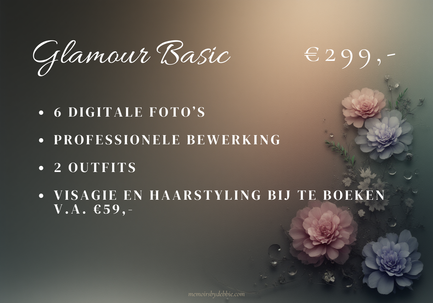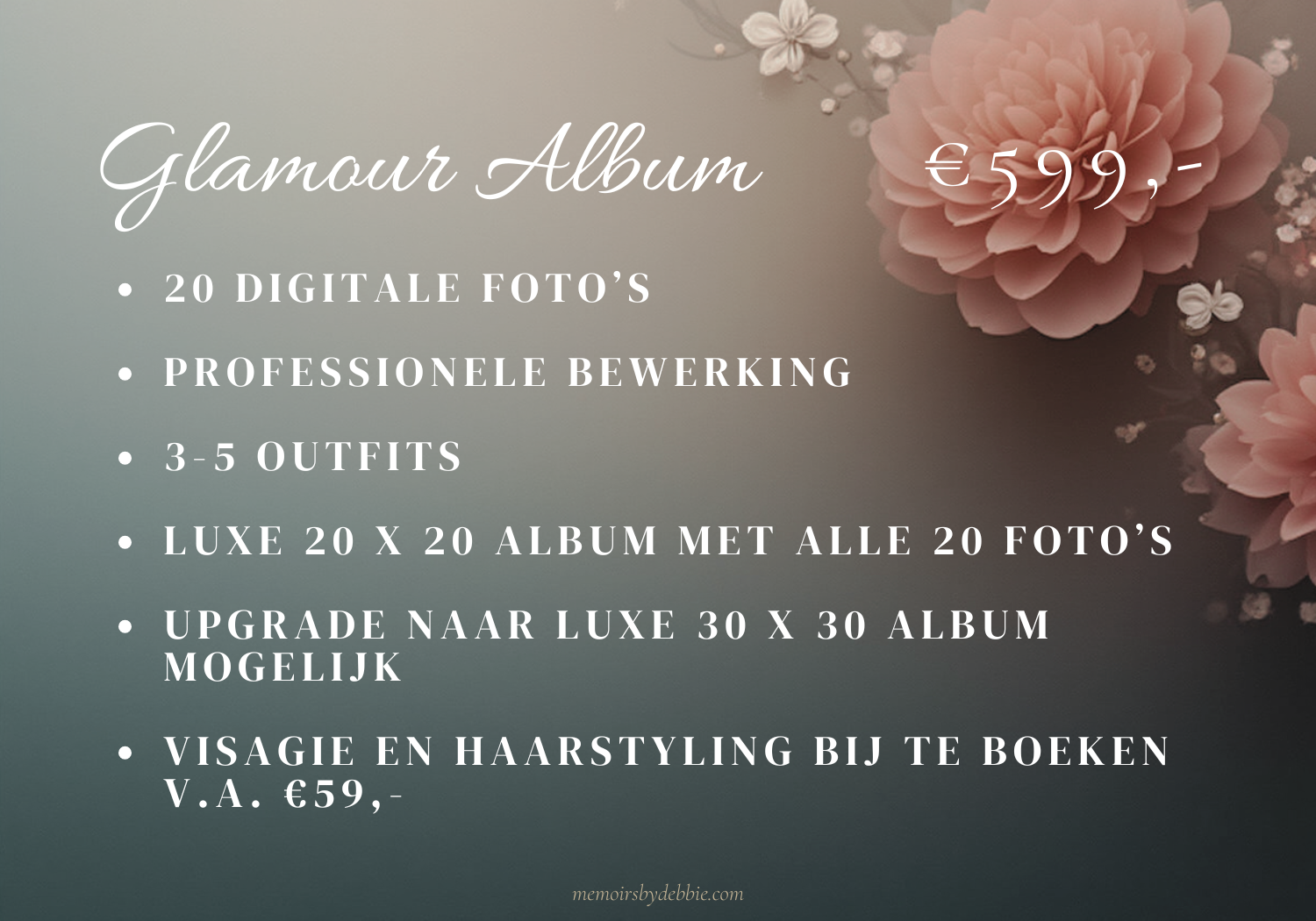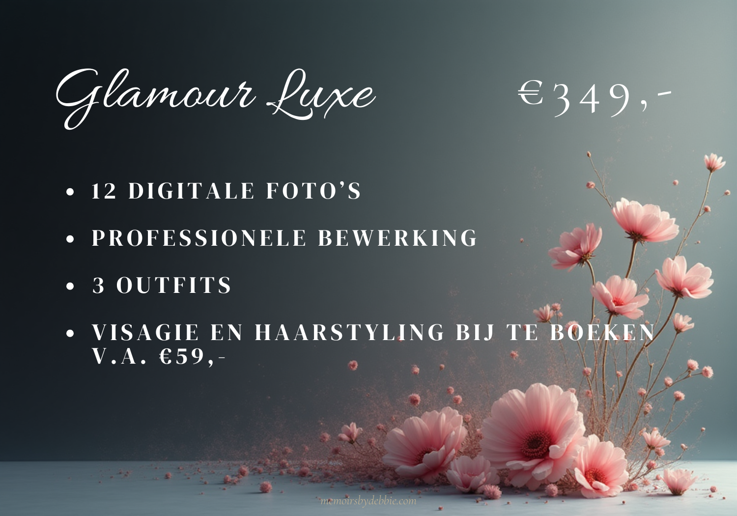 Laat uw innerlijke kracht stralen met een Glamour shoot bij Memoirs by Debbie Photograpy. Voel u zelfverzekerd en laat u van uw beste kant fotograferen. Elke vrouw zou zo'n verwenmomentje voor zichzelf moeten hebben. Of u nu even wilt ontsnappen aan uw actieve leven, een drukke moeder bent of gewoon zin heeft zich lekker op te (laten) tutten en in de watten te leggen.. Bij ons bent u aan het juiste adres.