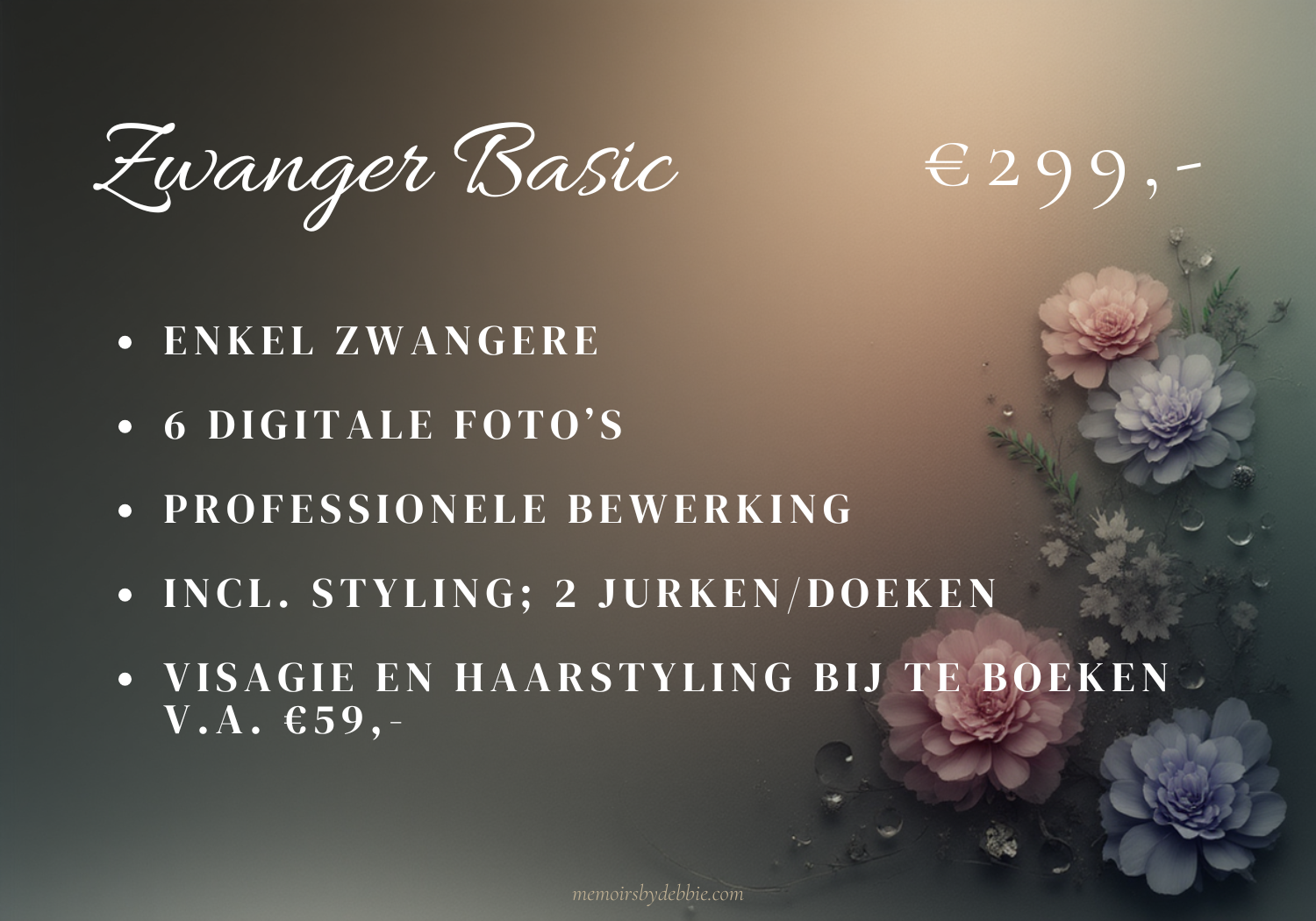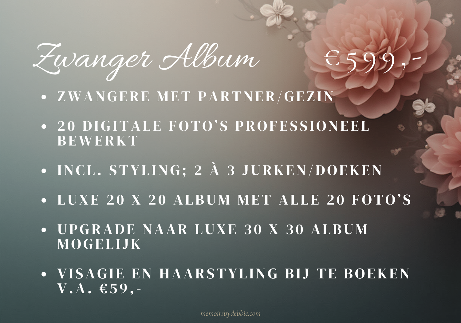 De beste tijd om een shoot te doen is voor iedereen verschillend. Het belangrijkste is dat je buik mooi rond is en bij voorkeur dat de baby nog niet ingedaald is. Dit is meestal zo tussen de 30 en 36 weken, maar hier zijn altijd uitzonderingen op. Bespreek de mogelijkheden met ons.